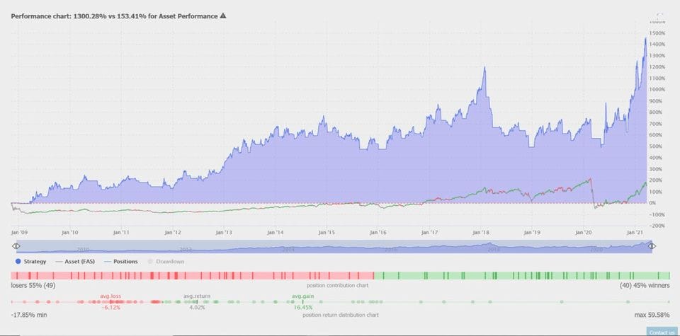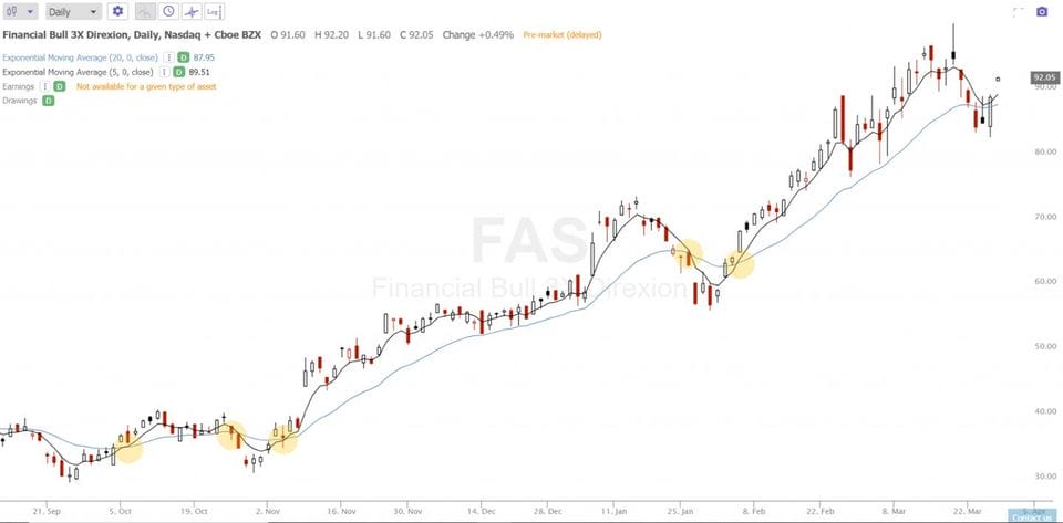 The below example shows the long term backtest on the $FAS ETF 3X leverage financials buying when the 5-day ema crosses and closes above the 20-day ema then selling when the 5-day ema crosses and closes back under the 20-day ema.