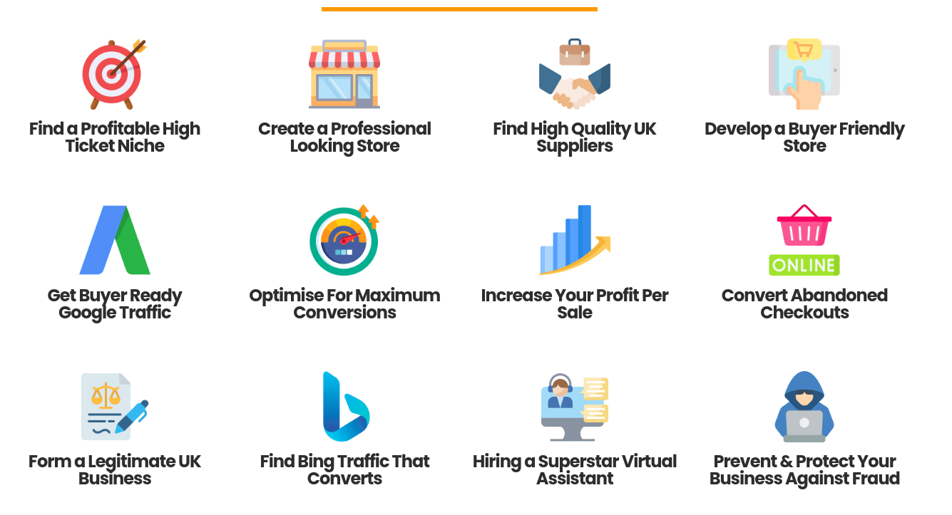 The course is absolutely perfect if you have never done this sort of thing before, it teaches you how to build a site, find suppliers, and build a business around dropshipping and more importantly for me, it taught me how to use Google ads effectively.